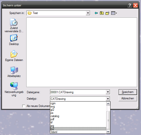 Unter „Dateityp“ wählen Sie „ig2“ (IGES 2D) aus und speichern die Datei unter einem beliebigen Namen ab.