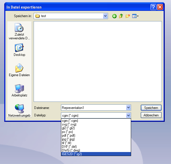 Unter „Dateityp“ wählen Sie „ig2“ (IGES 2D) aus und speichern die Datei unter einem beliebigen Namen ab.
