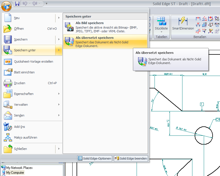 Klicken Sie auf das Solid-Edge Logo und öffnen dass Applikations-Menü. Anschließend auf die Funktion „Speichern unter“. In dem sich öffnenden Menü wählen Sie die Option „Als übersetzt speichern“ aus.