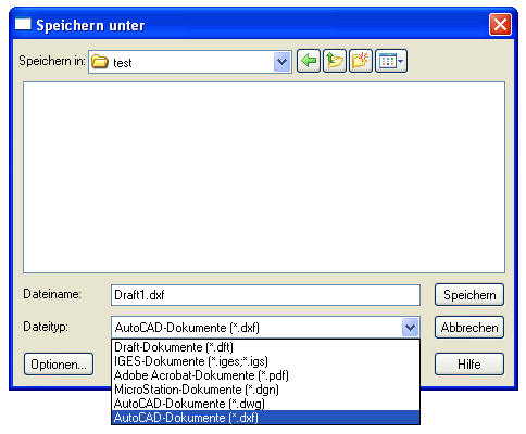 Unter „Dateityp“ wählen Sie „AutoCAD-Dokumente“ aus. Sie können wählen, ob Sie das DWG oder das DXF Format verwenden möchten. Wählen Sie danach den Speicherpfad aus und klicken abschließend auf „Speichern“.