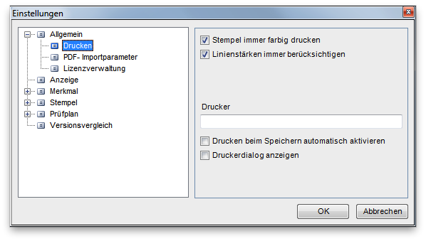 • Drucker beim Speichern automatisch aktivieren: Druckt automatisch einen Prüfplan bei jedem Speichervorgang.