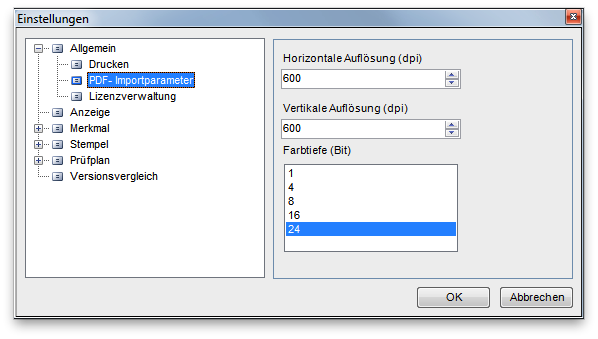 • Farbtiefe (Bit): Legt die Farbtiefe in Bit beim Import von PDF-Dateien fest.