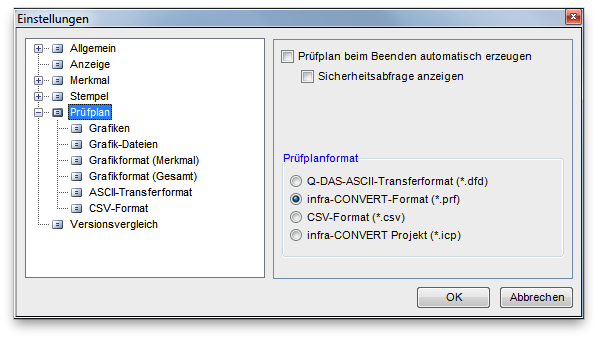 - Prüfplanformat: Über diese Option wird das Prüfplanformat für die automatische Speicherung festgelegt.