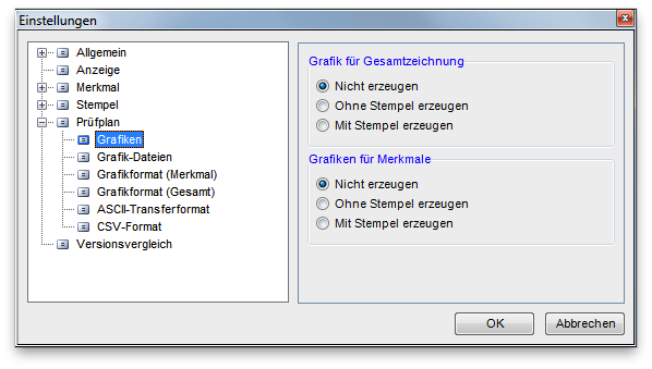 - Grafik für Merkmale: Über diese Optionen wird festgelegt, ob und in welcher Form infra-CONVERT beim Erzeugen von Prüfplänen die Grafiken aller Merkmale erzeugt.