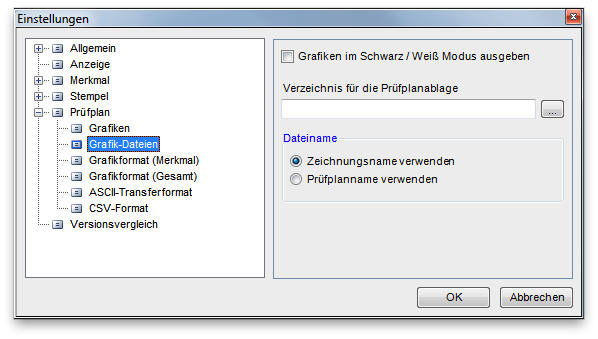 - Dateiname: Diese Option legt fest ob der Dateiname der Prüfplangrafiken den Zeichnungsnamen oder den Prüfplannamen enthält.
