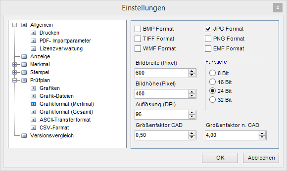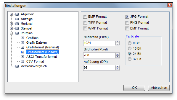 Diese Optionen legen fest in welchem Dateiformat und mit welcher Auflösung und Farbtiefe die Merkmalsgrafiken erstellt werden sollen.